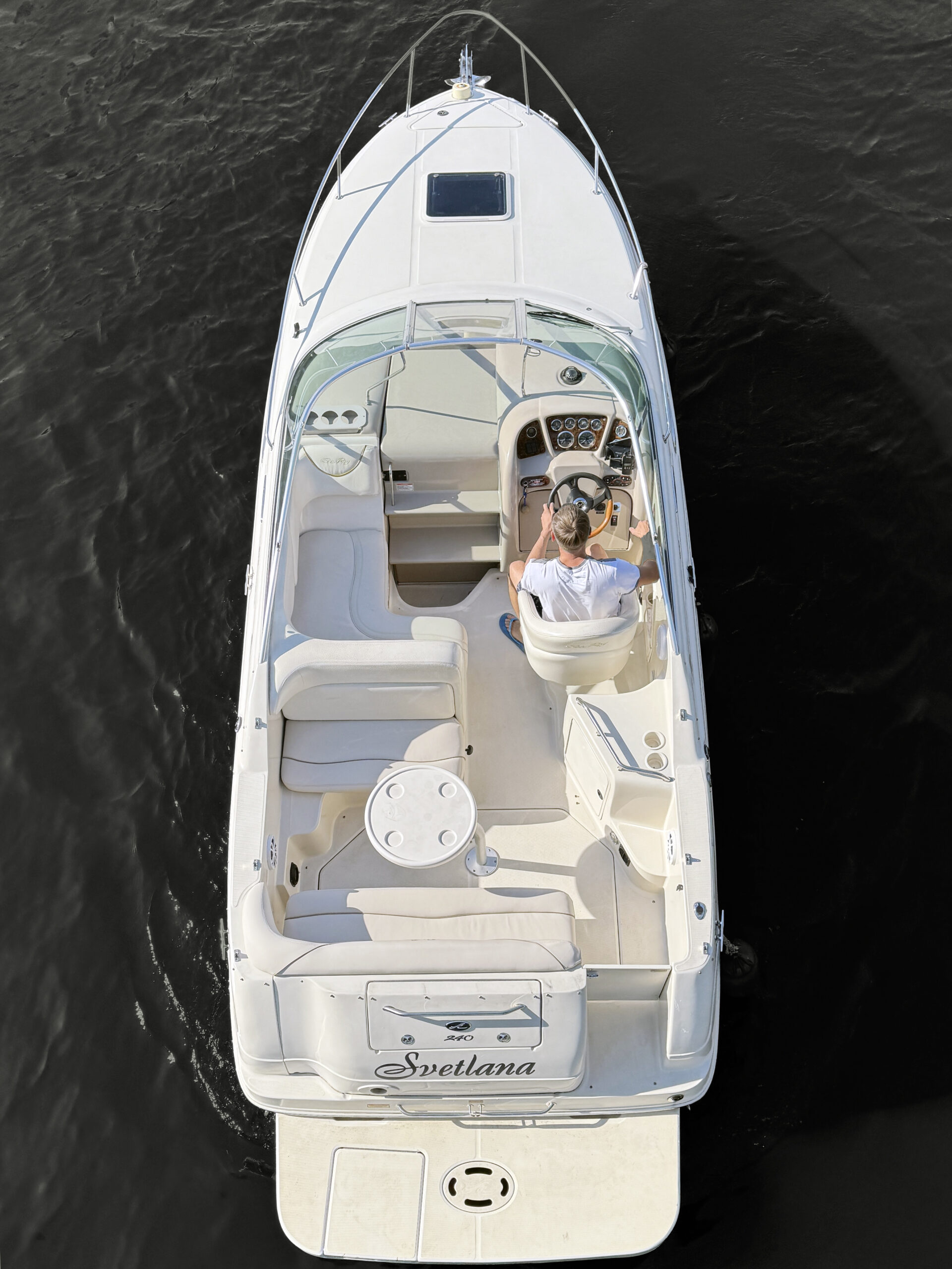 Катер Sea Ray 240 Sundancer рассчитан на компанию до 7 гостей. Финальный комфорт зависит от сценария аренды: прогулка, фуршет, фотосессия или программа мероприятия на воде.