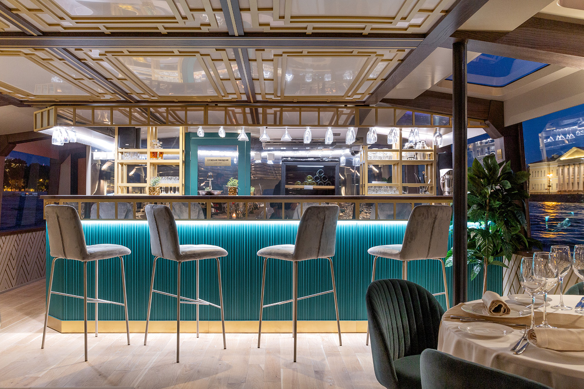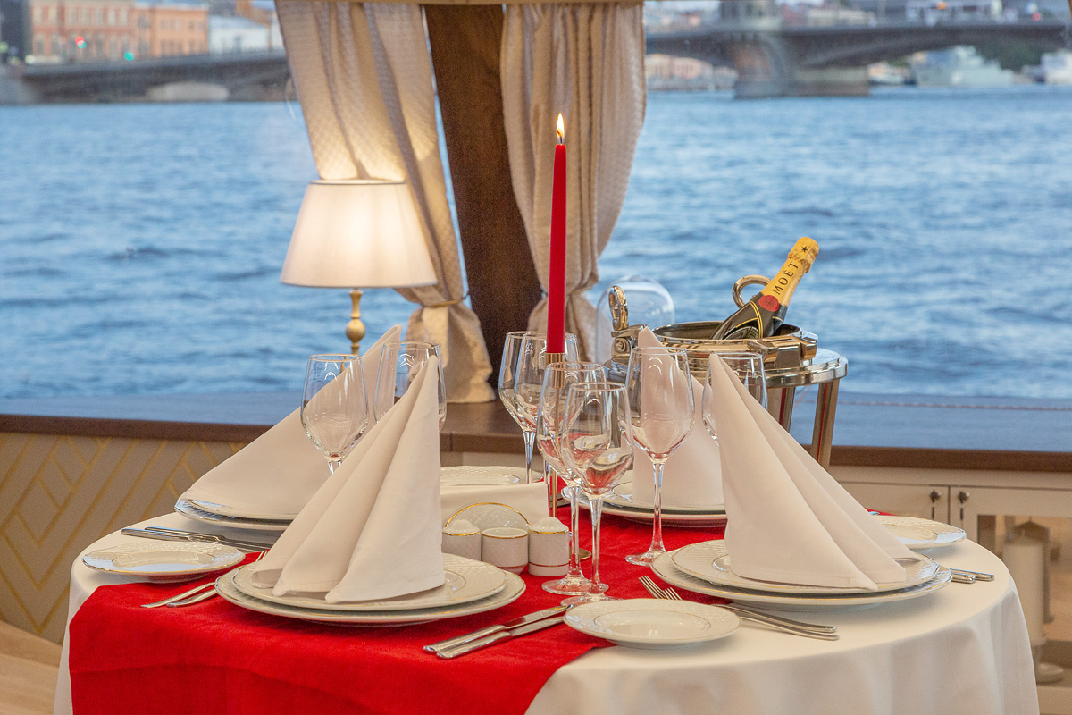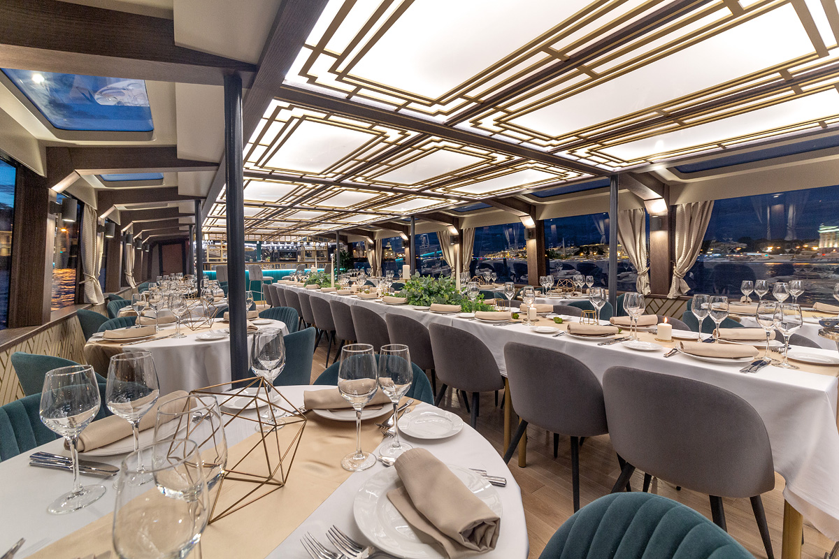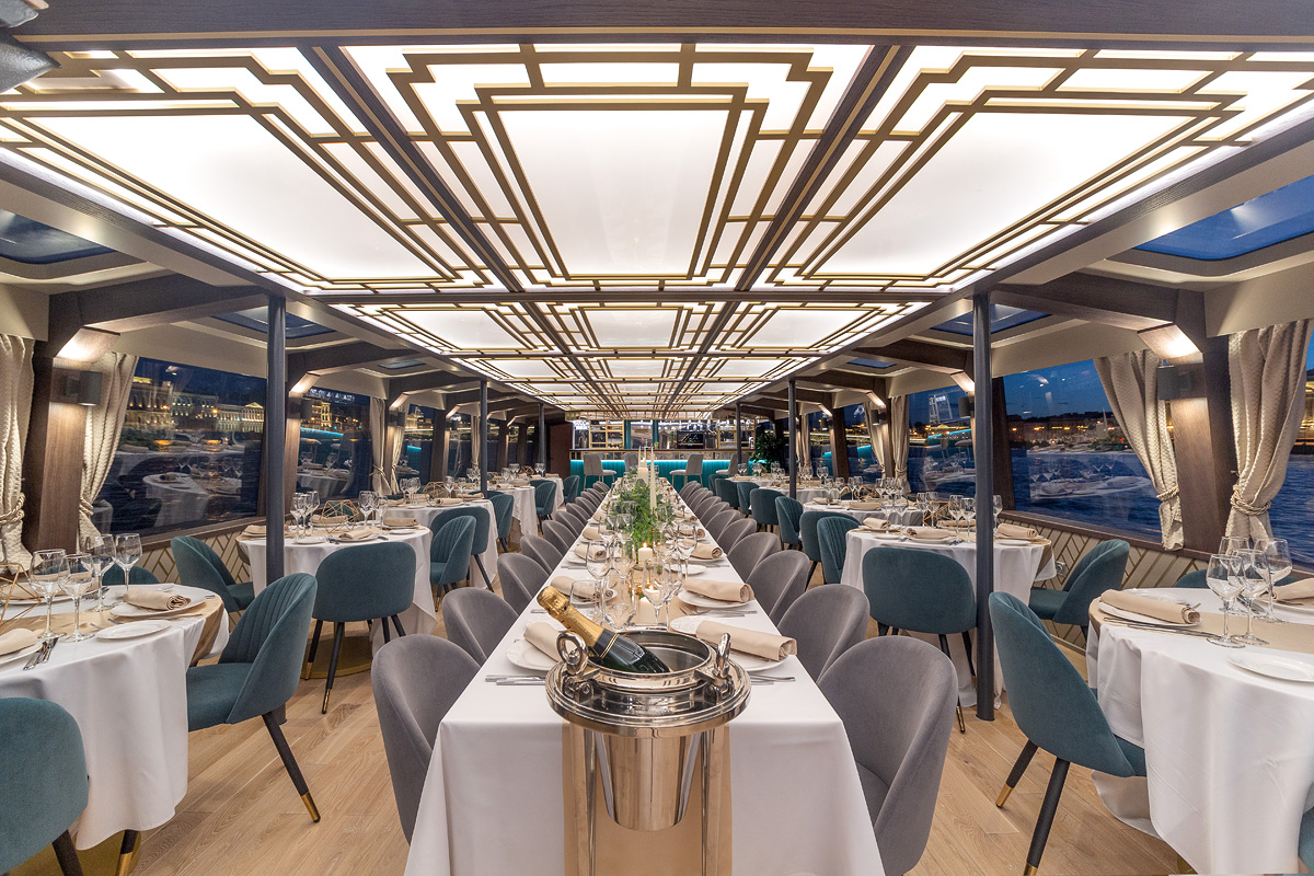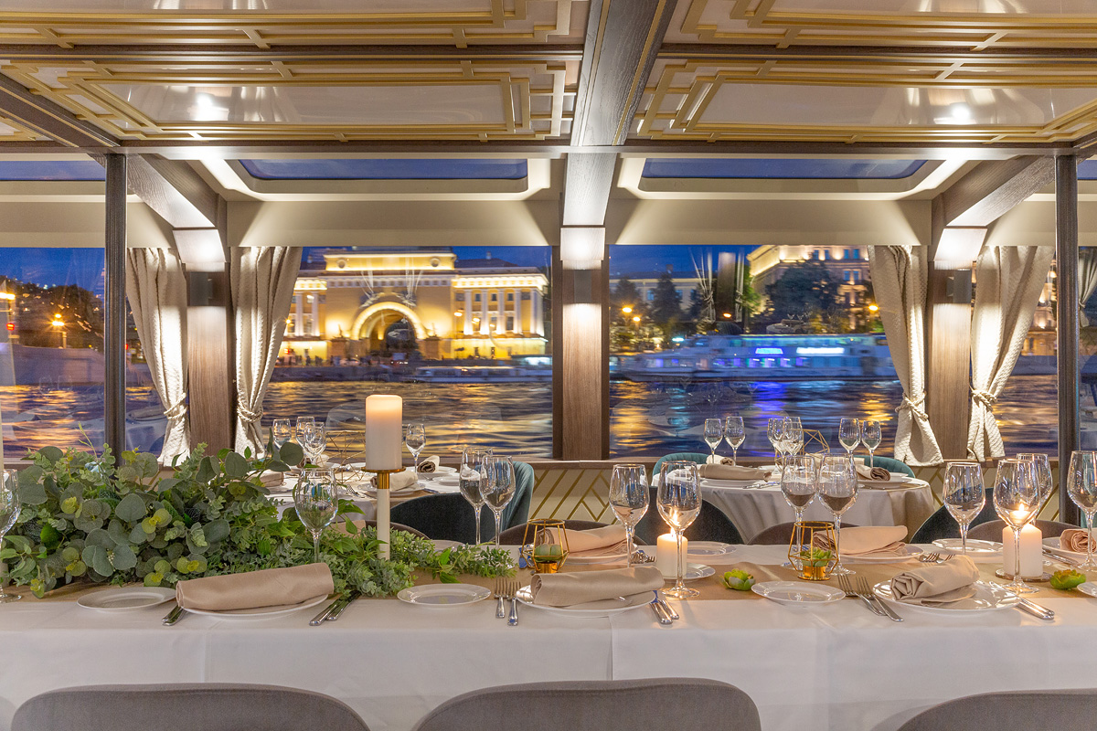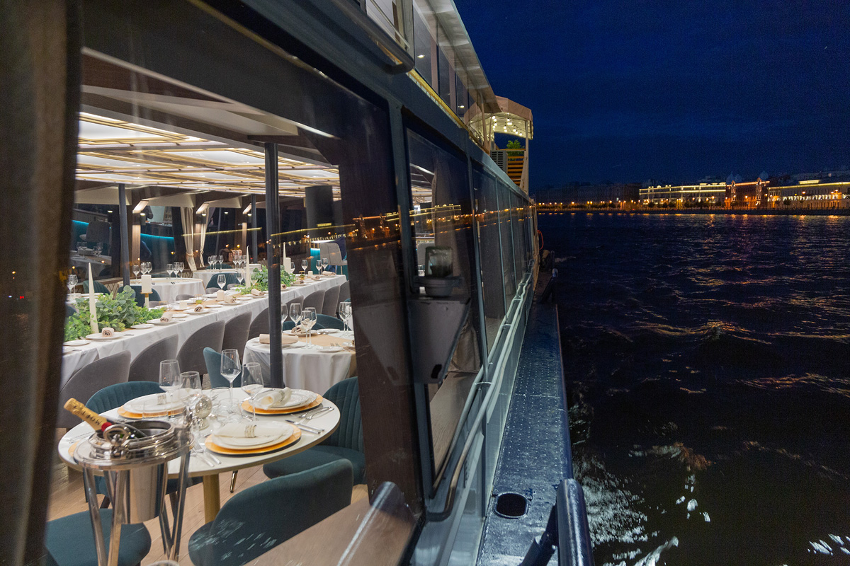 Формат для банкетов, свадеб, корпоративов и прогулок по Неве с комфортной посадкой большой компании. Из важных опций чаще всего выбирают санузел и столик.
