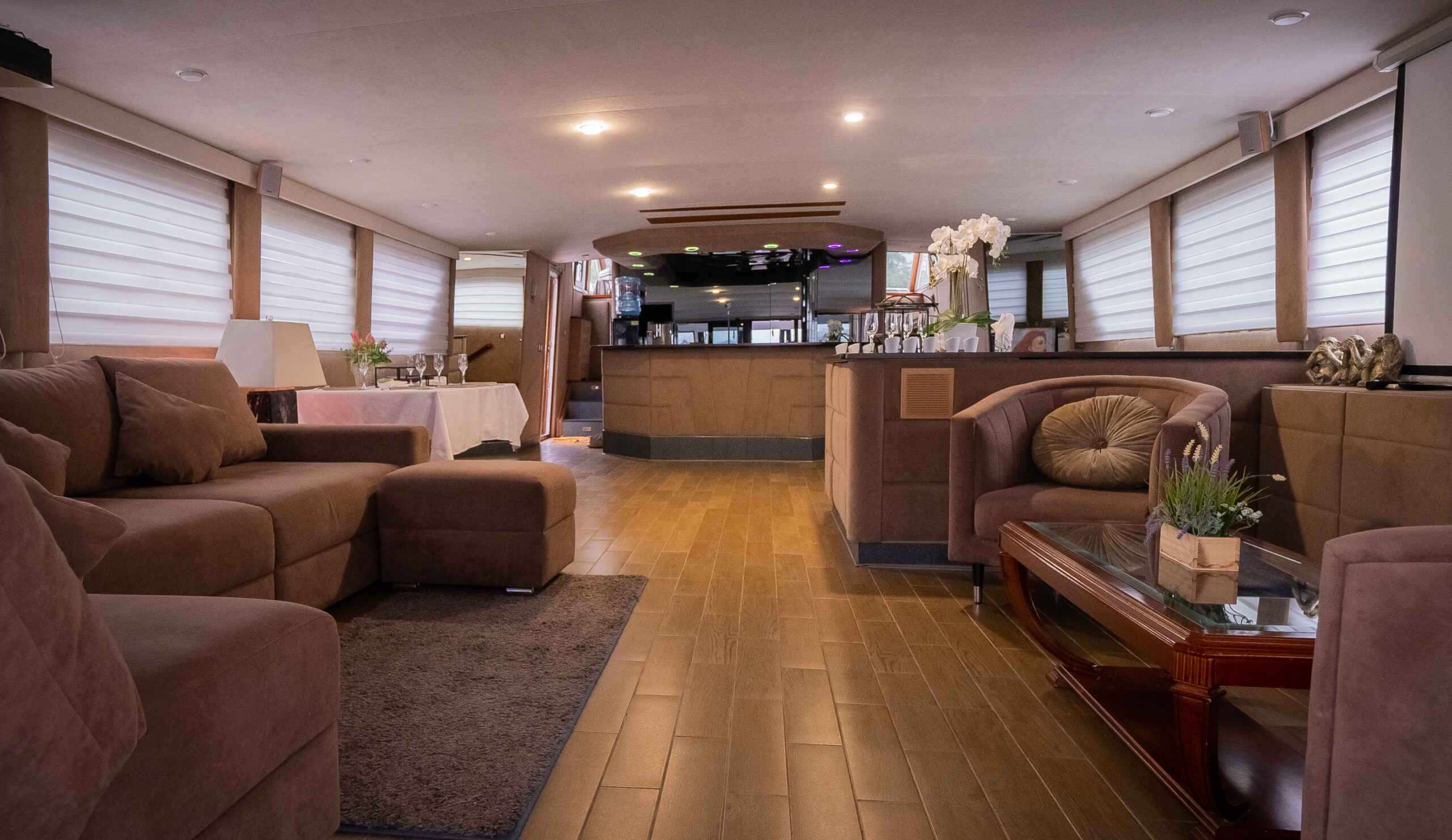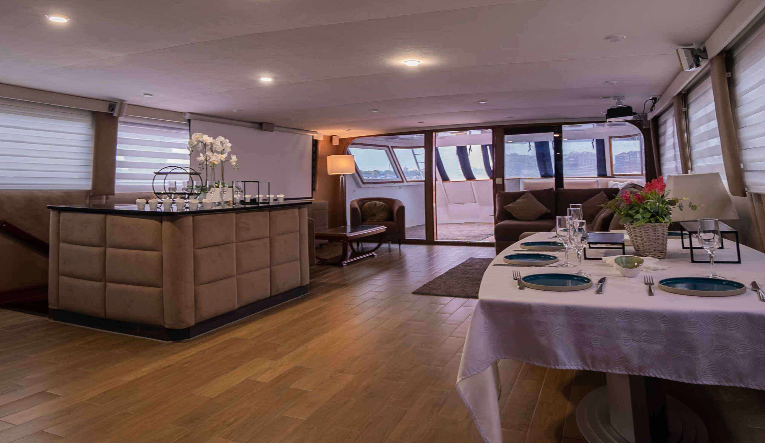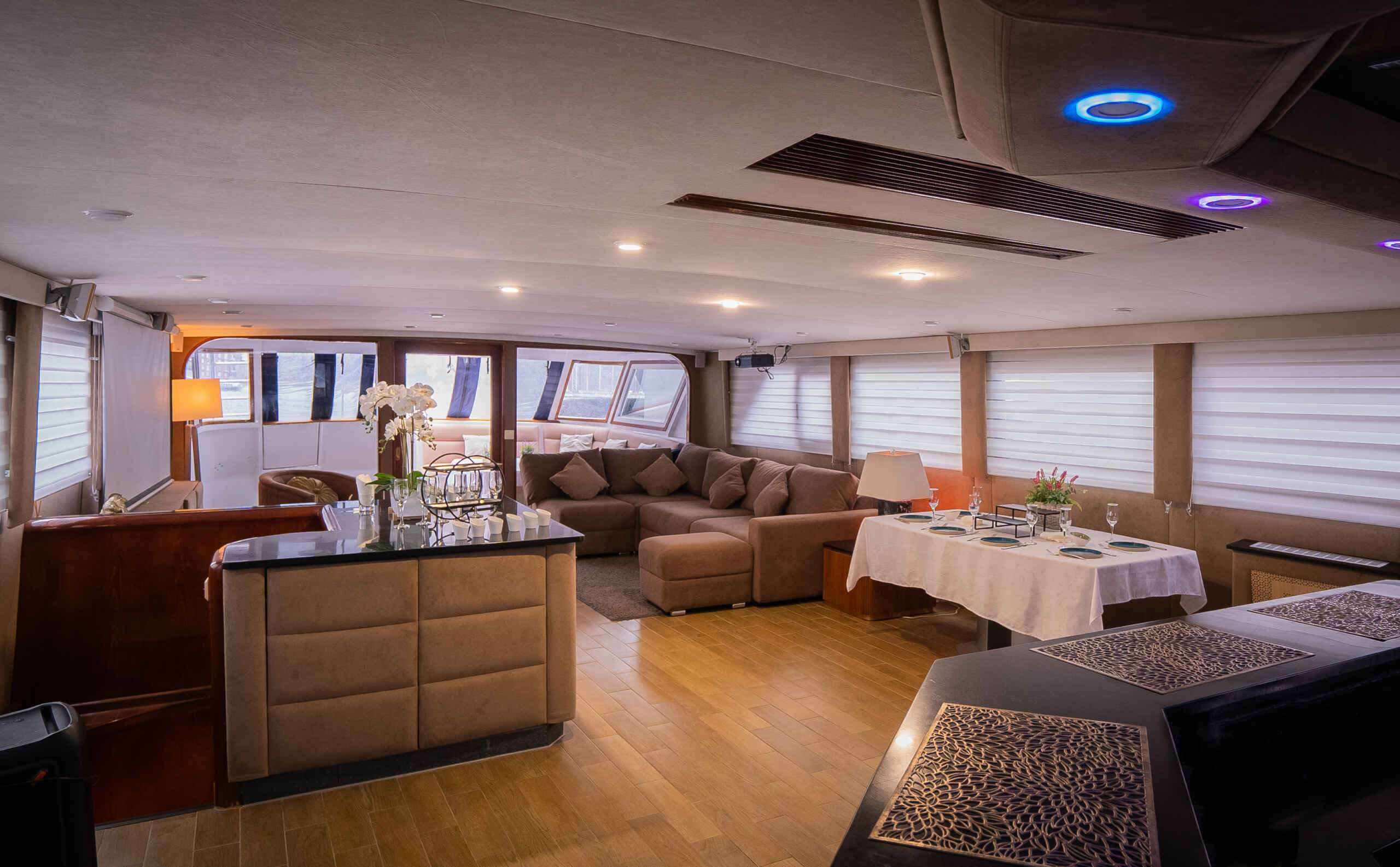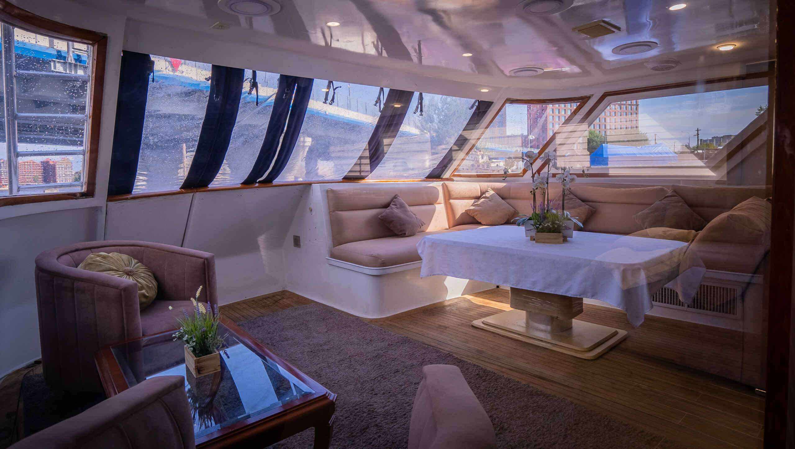 - Формат яхты дает больше приватности и подходит для спокойного отдыха, деловых встреч и выхода в сторону Финского залива.