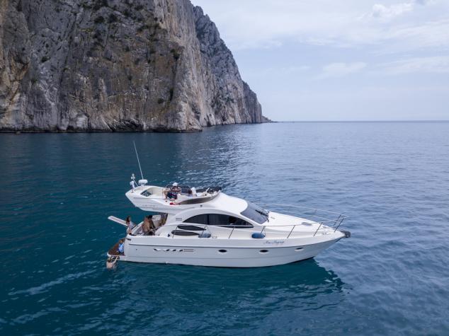 Комфортный катер для семейной прогулки, дня рождения или камерного события на воде в Балаклаве. Корпус 34 ft дает более спокойную посадку и комфортную палубную зону.